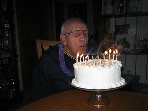 My dad blowing out his birthday candles.